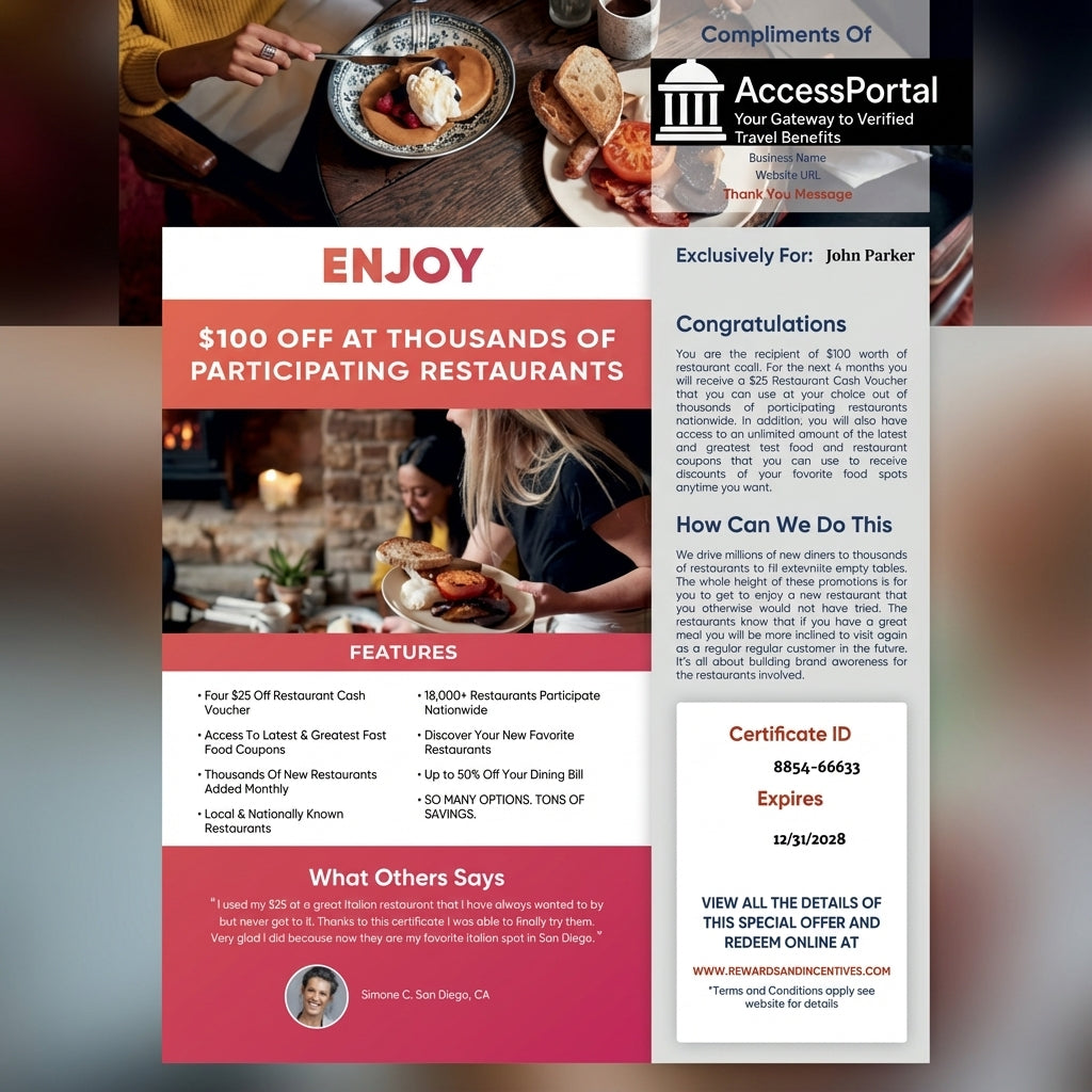 Each certificate includes both hotel savings credits and restaurant dining credits that you can use at thousands of participating locations nationwide.
